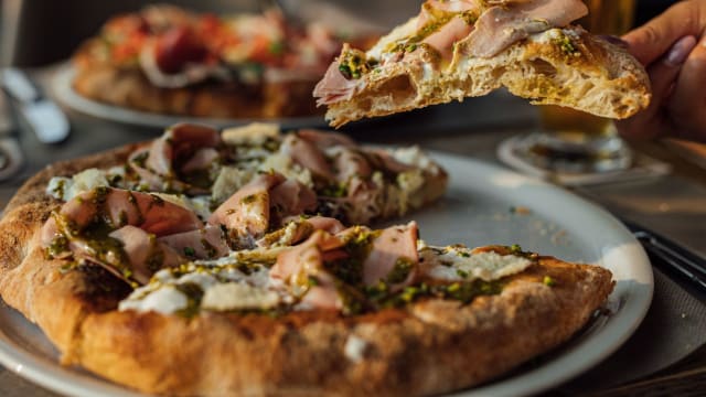 Prosciutto di parma, stracciatella, salsa di pomodoro, pomodorino piccadilly rosso e giallo confit, scaglie di grana 24 mesi