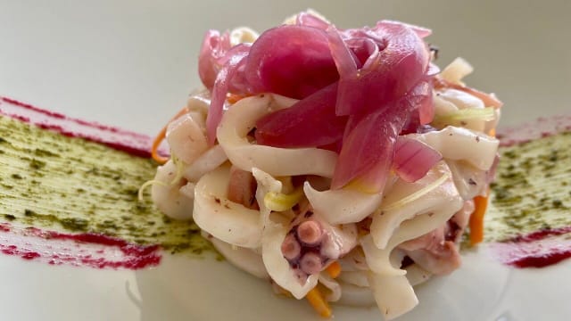 Assaggi di pesce composto da insalata di mare, tagliatelle di seppia e zucchine con cipolla rossa all'agrodolce e carpacci di pesce misti