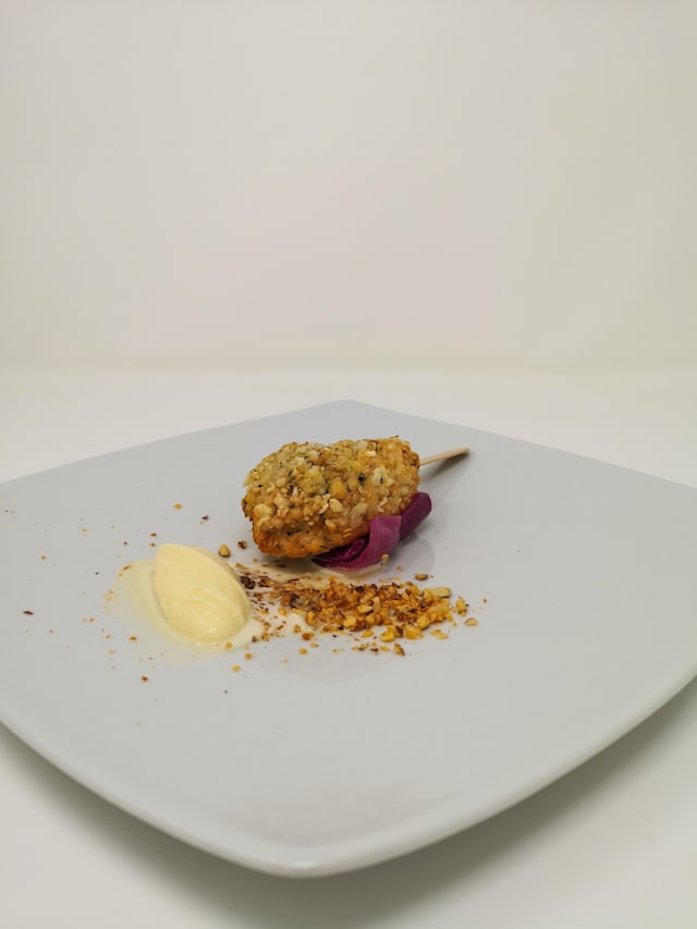 Al peperone crusco e pistacchi con gelato al caramello salato