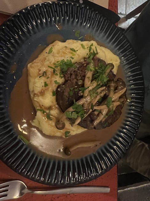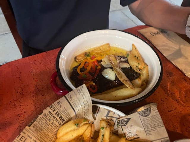 4.5/10I ordered stew. And white wine, which I just like. The meat in the stew was well done. But half floated in fat. I made a mistake with the choice of wine. The waiter also suggested garlic bread - it's a good local snack! It turned out to be thawed buns, burnt and abundantly covered with olive oil. I did not order dessert - tiramisu (!), ice cream ...