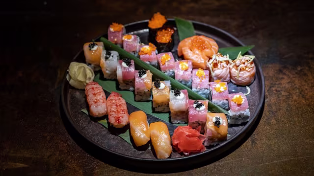 - Scampi, mango, tartare di scampi, lime, tobiko gold, furikake