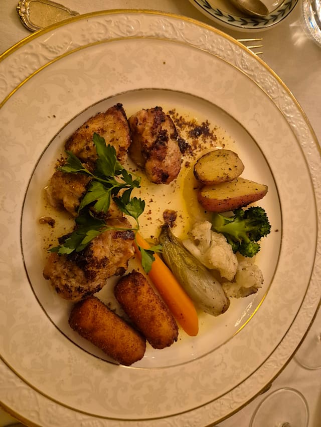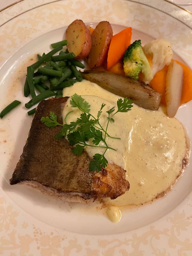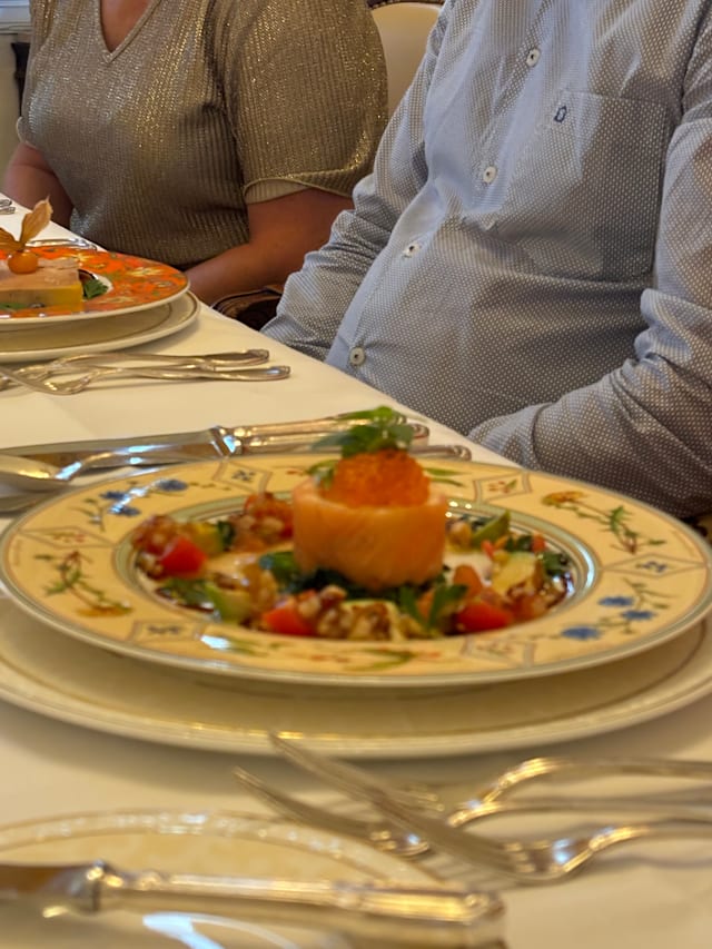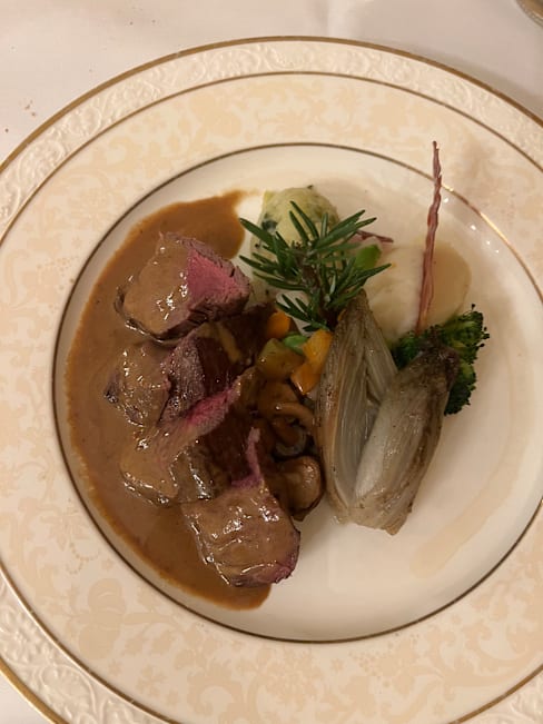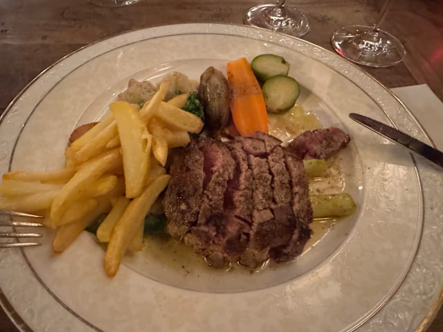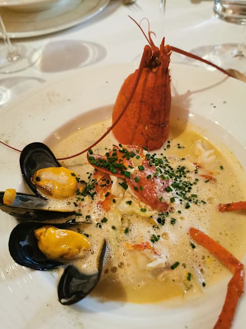8/10We were shown to the cellar where people were drinking and asked for our drink order. No list presented. We don't normally drink aperitifs and were caught off guard, but ordered something anyway. We were brought parmesan and olives (nice) and then an amuse bouche of shrimp, tomato and a dressing - pleasant but not exceptional. Then the waiter came. He didn't show us a menu but had a friendly discussion with us about what we liked to eat. It was an unusual approach and we just went along with it, but on reflection we felt we were manipulated into ordering what the kitchen wanted us to eat. The fish soup was very good, though I didn't detect the lobster that had been mentioned in the cellar discussion, unless the shells had formed the basis for the stock. One of us had fillet steak (very good) and the other had sweetbreads (also very good) but the vegetable accompaniment was a smear of potato puree and 5 tiny pieces of very ordinary everyday vegetables. Although they were well treated (al dente) it was rather unimaginative and uninteresting. We would go again, but would ask to go straight to our table and see a menu. Friendly service and beautiful and elegant surroundings.
