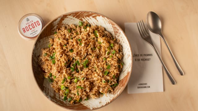 Arroz salteado con pollo terminado con salsa de soja y aromatizado con sésamo.