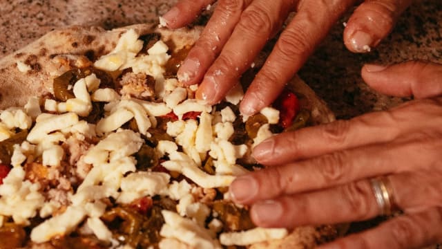 Pizza in pala ripiena con peperoncini verdi di fiume, pomodoro giallo e rosso, salsiccia di maialino nero, pecorino bagnolese irpino