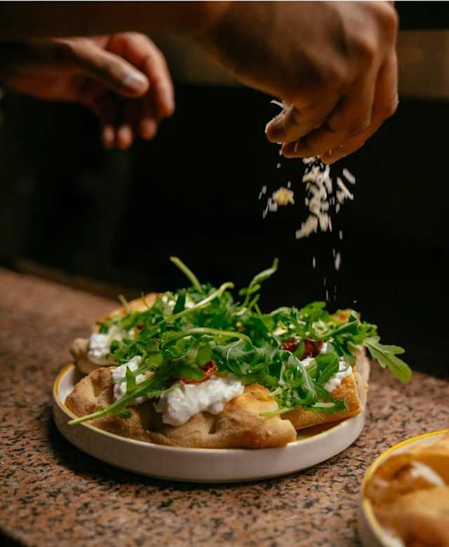 - Pane cotto al padellino con impasto ai cereali, segale, farro e mais, dalla crosta friabile con tartare di pomodorino rosso e basilico, stracciata di fior di latte, olio d'oliva