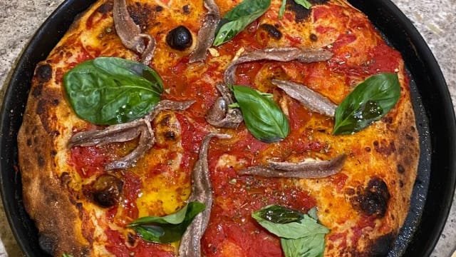 - Pizza in pala ripiena con stracciatella pugliese, alici di cetara, olive taggiasche, fiori di zucca agli agrumi, olio di cantine barone