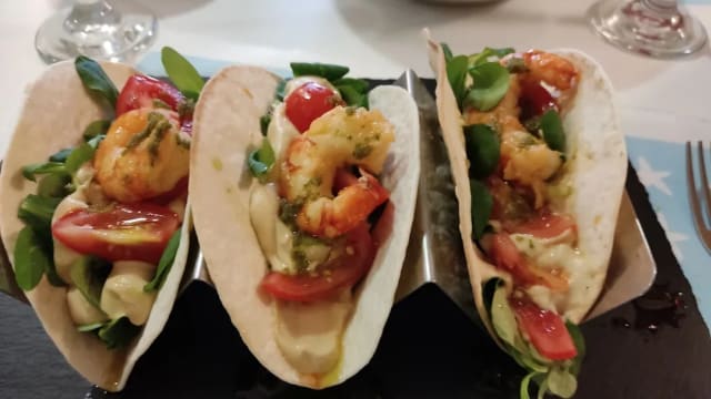 Tacos con polpo, valeriana, pomodorini, gamberi, polpo e guacamole