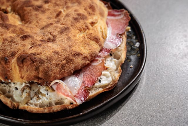- Crema di latte, fior di latte d’agerola, carciofo* e fungo cardoncello al forno, polvere di olive, pomodorini semidry, prosciutto cotto artigianale.