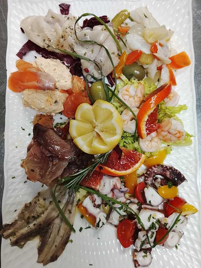 - Polipo a limone, salmone speziato con stracciatella di bufala, alici marinate, ricciola in carpione con cipolla di tropea, carpaccio di pesce spada, gamberi con scarola riccia