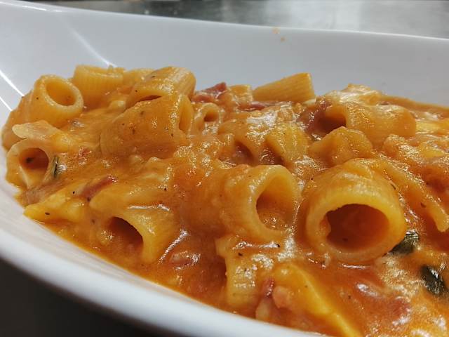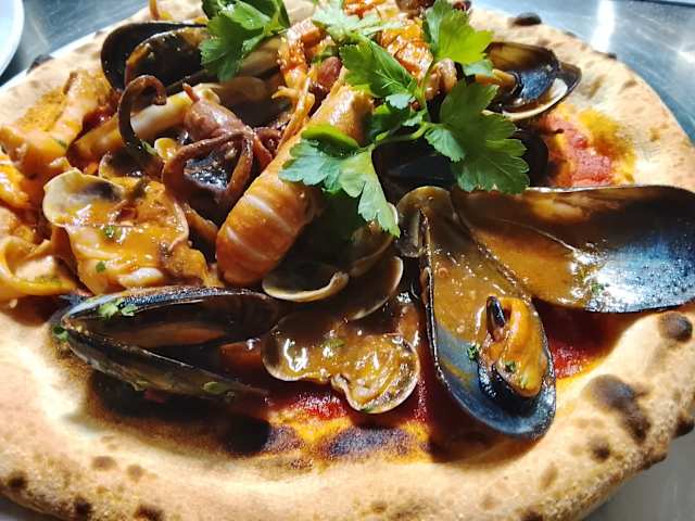 - Moscardino al guazzetto di datterino rosso servito su pizza fritta