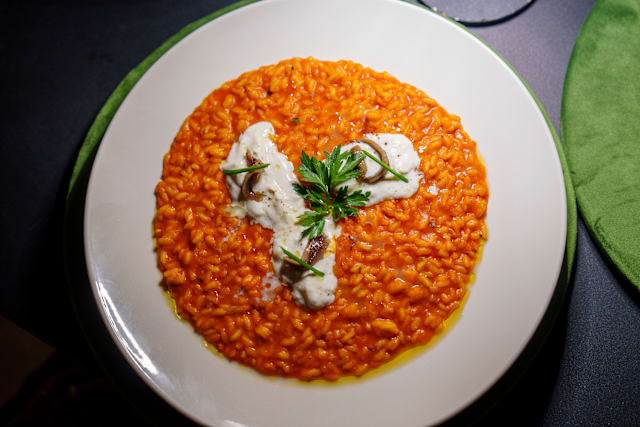 - Risotto alla siracusana con crema di pomodoro, filetti di acciughe, capperi, olive e stracciatella