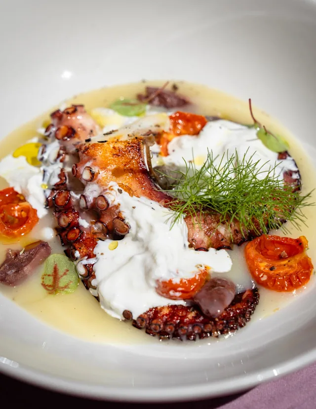 - Polpo alla catalana con cigliegino, patate, olive nere, arance, basilico e cipolla rossa di tropea