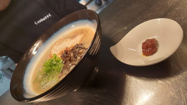 - Ramen: brodo di ossa maiale (noodle sottili) Guarnizione: Porchetta speciale, cipolla verde, alga Kikurage