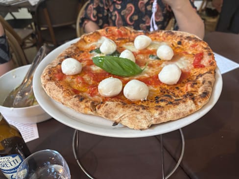10/10It is a rooftop restaurant uniquely located at the northern edge of Galleria Vittorio Emanuel. We sat oudoors, where you were far away from the traffic & crowds below. We shared a pizza margherita and large Caesar salad, and homemade cheese cake, all delicious, but the pizza rivaled the best I’ve had in Naples. Our server was friendly and helpful and this restaurant will head my list for any return trips to Milan.