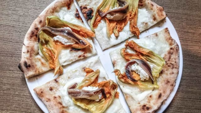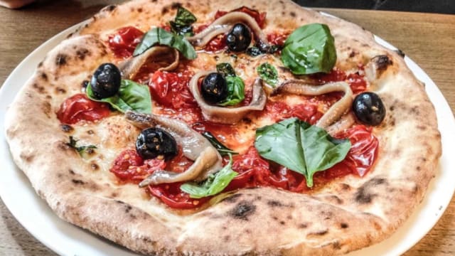 Mozzarella di bufala campana DOP, pomodorino giallo del piennolo, acciughe, olive nere taggiasche, origano di montagna, basilico e olio evo