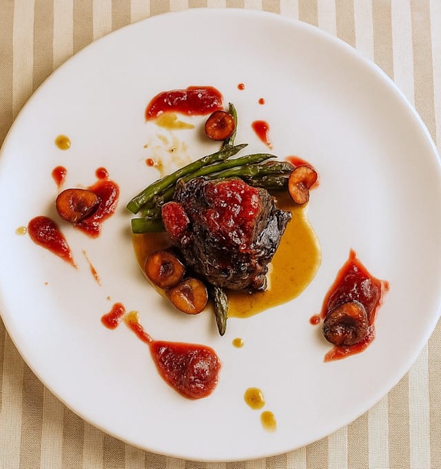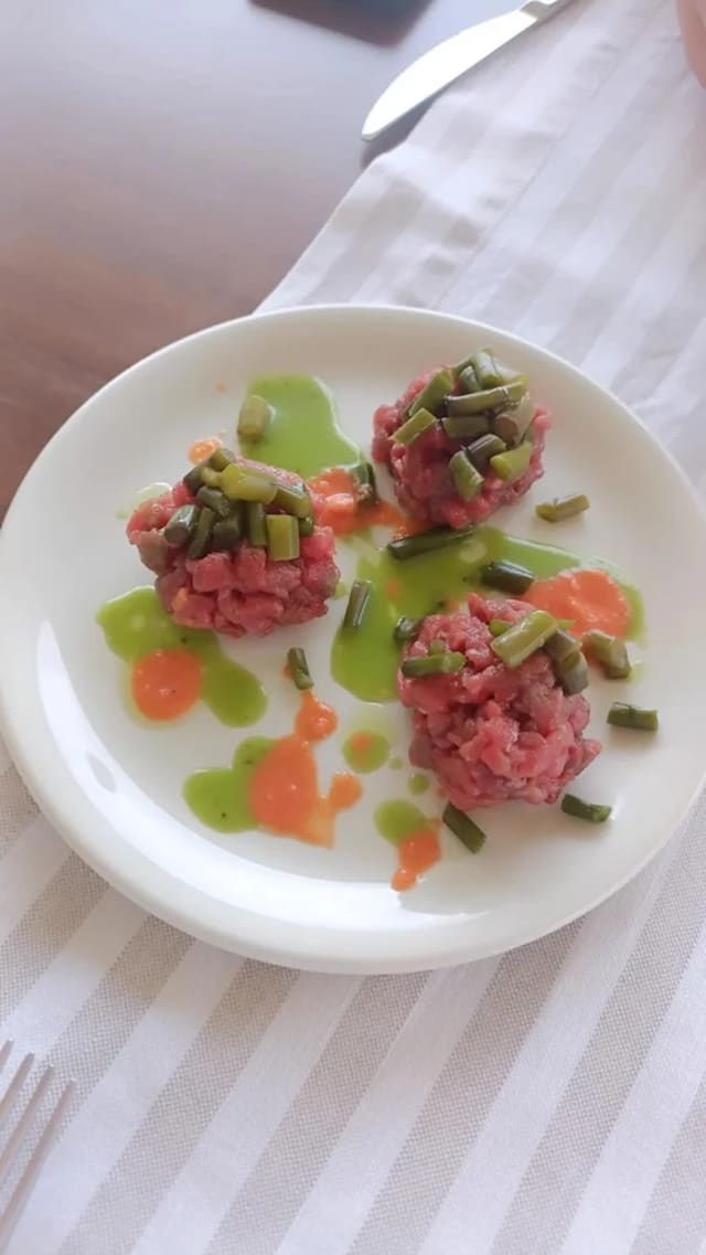 - Lingotto di manzo con carpaccio di peperoni e porro bruciato