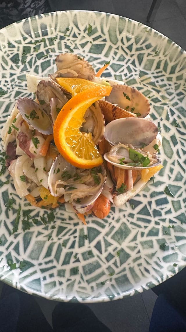 Vongole, gambero rosso, julienne di zucchinette, pomodorino e mollica tostata