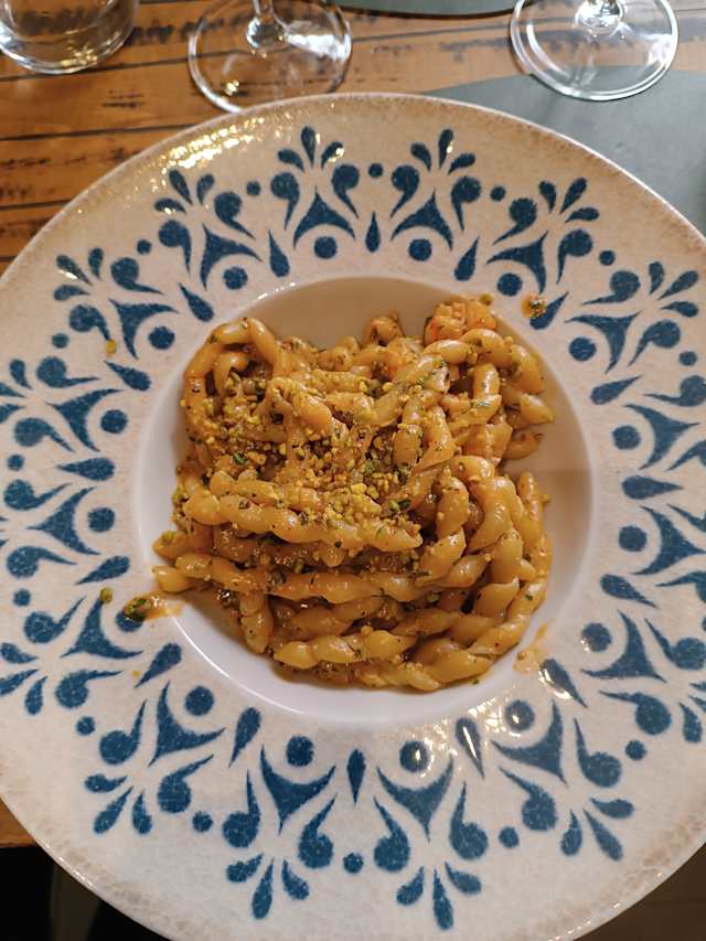 - Pasta fresca busiate, gambero, pistacchio, sale, pepe, vino, brandy, extra virgin olive oil