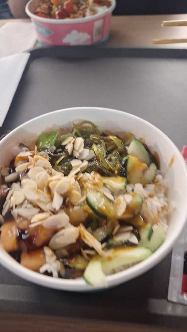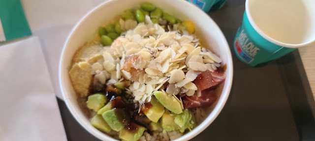 - Riso bianco, tartare salmone, pomodorini, avocado, salsa teriyaki, maio wasabi, mandorle