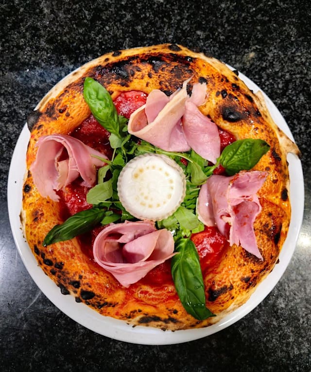 Salsa di pomodoro, stracciatella di burrata, patè di olive e prosciutto crudo (doppio impasto)