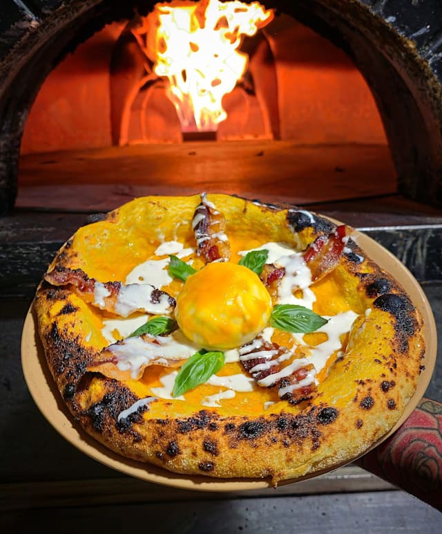Salsa guanciale, cipolla caramellata in cottura, stracciata al pecorino, guanciale croccante, pepe e basilico