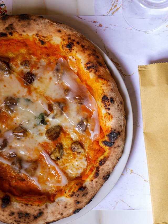 Pomodoro san marzano, melanzane impanate e fritte, parmigiano reggiano 24 mesi, fior di latte basilico fresco ed olio evo. una pizza che sa di casa, ma con un tocco da regina.
