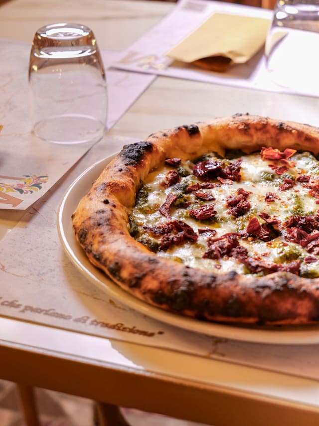 Pomodoro san marzano, fior di latte, ricotta di bufala dop, salame napoli "tomaso salumi", pepe nero arlecchino, basilico ed olio evo. una bomba verace, tra cremosità e intensità.