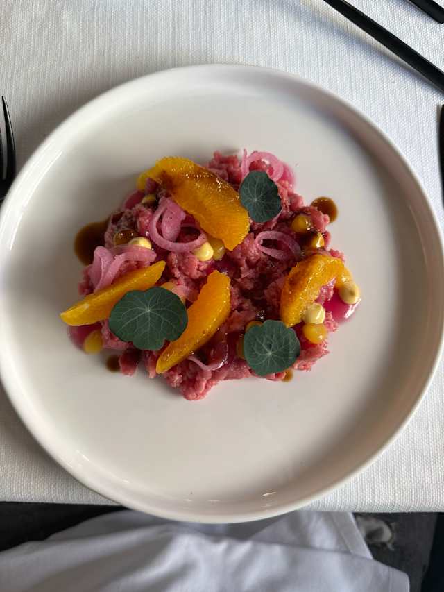- Tartare di garronese veneta, arancia, senape di Dijone e cipolla rossa