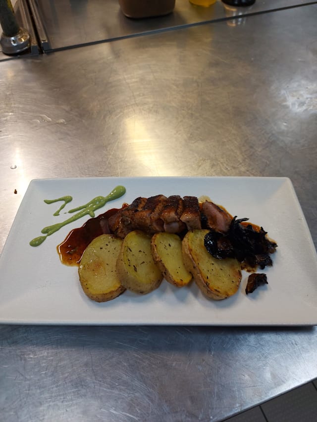 - Cotto a bassa temperatura, glassato al miele di spiaggia con burro salato, cipolla bruciata e patata a fette