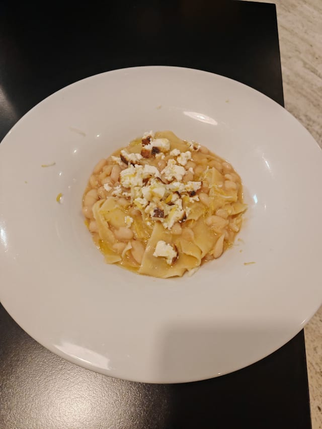 - Maltagliato con crema di piattella pisana, pancetta di grigio, ricotta al forno e scorzette di limone