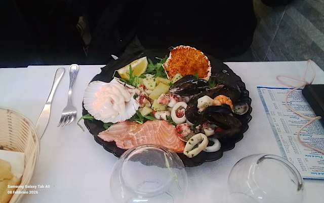 - Capesante, salmone, gamberetti in salsa rosa, polpo con patate e insalata di mare crudo