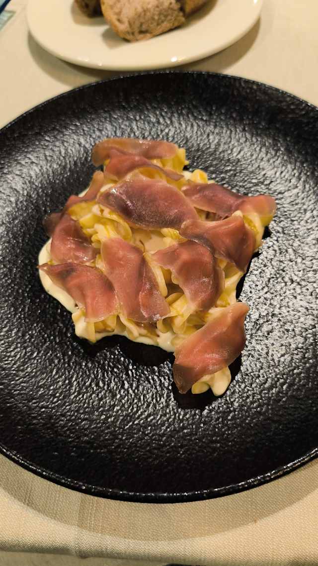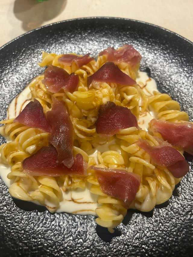 - Eliche di pasta fresca, crema di pecorino, ristretto al pedro ximenez e speck d’anatra