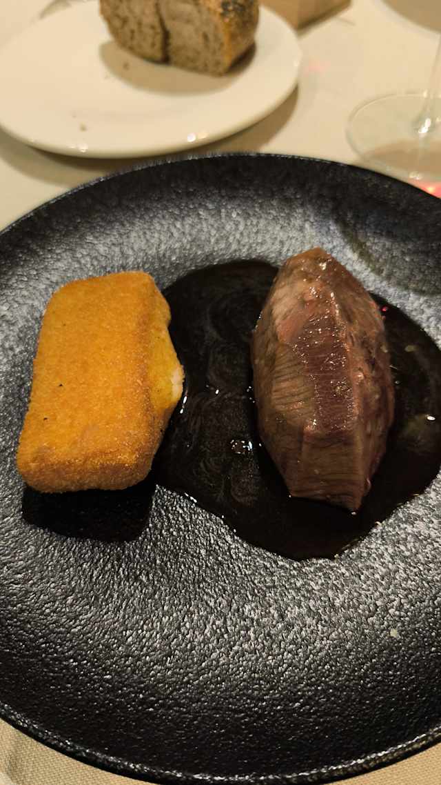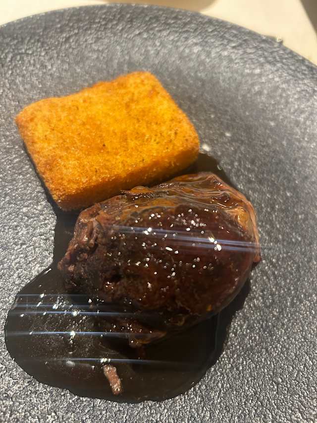 - Guancetta di manzo brasata al nebbiolo con patata schiacciata croccante