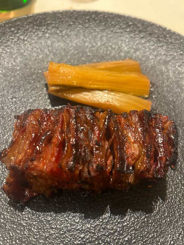 - Stratagliata di fassona piemontese , guanciale e riduzione di ponzu, sedano in osmosi alla melagrana