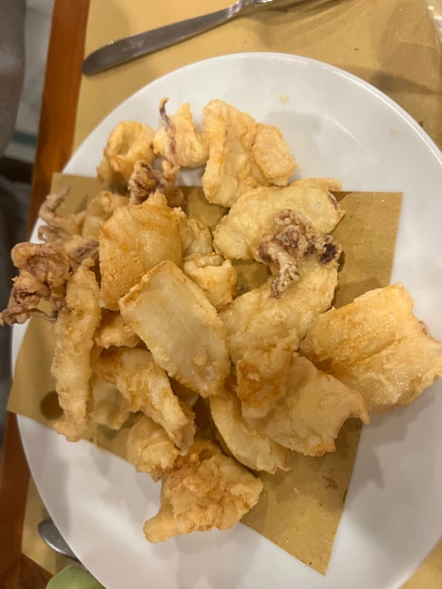 Tagliolino al nero di seppia fatto in casa, calamari pomodorino confit e porri fritti