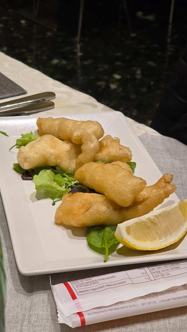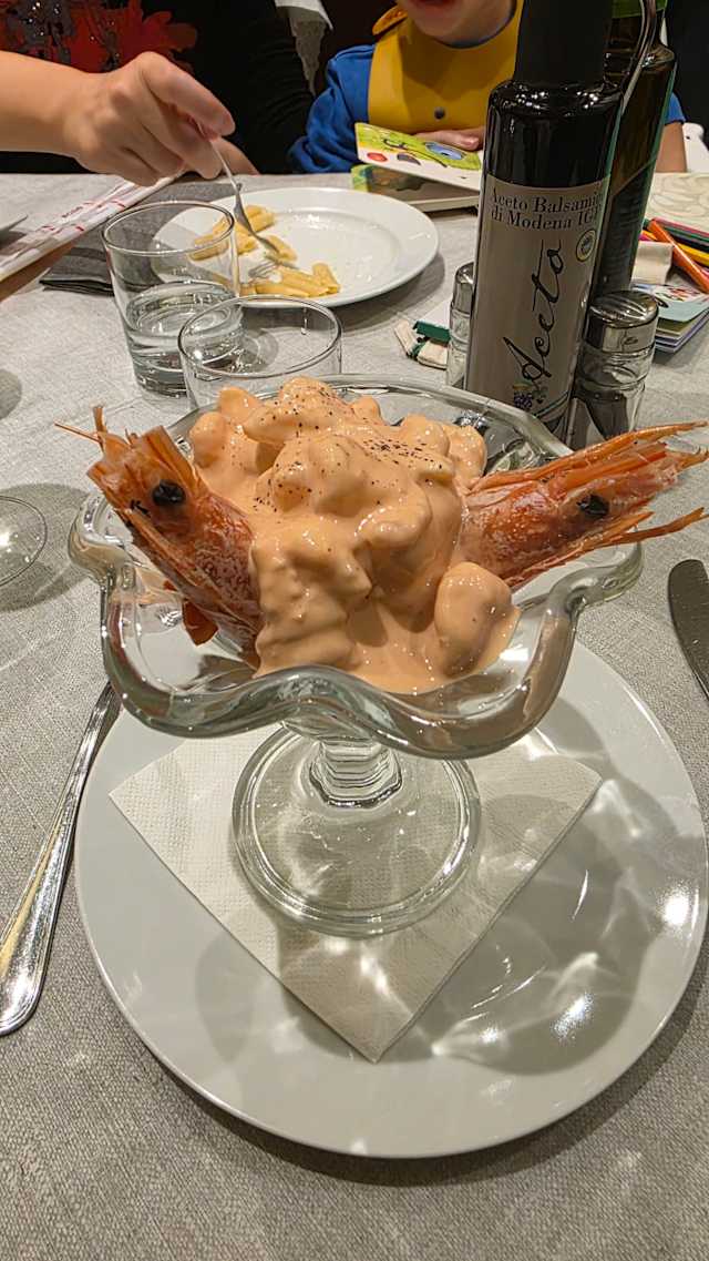 7/10I had spaghetti allo scoglio, followed by grilled triglie (red mullet), a side of grilled vegetables, and tiramisù. Spaghetti allo scoglio is my absolutely favorite dish and I have had it countless times. I thought it was really good. It included clams, mussels, shrimp, calamari and a langostino in a light red sauce. I’d never had red mullet before and am not great at eating whole fish but I thought it was good also. The waiters do tout to people walking by which is usually not a good sign but I think the food was good and it gets good ratings. I was one of only two tables sitting outside probably because the weather was not great. The port area was really quiet overall when I was there. There is also an inside area also.