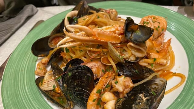 - Cozze, vongole, polpo, scampi, gamberi, pomodoro, aglio, olio extravergine e vino bianco