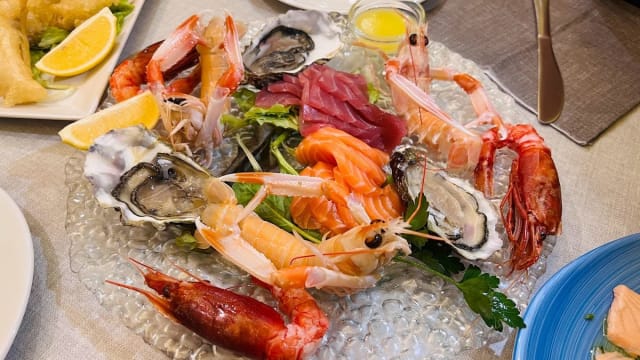 - Astice, granchio, gamberi, scampi, ostriche, gamberi rossi, tartare di salmone e tonno