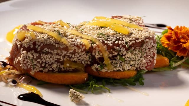 Tonno rosso* del mediterraneo croccante con cipolle ed uvetta caramellate e fiore di cappero croccante.