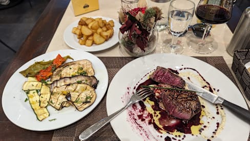 10/10My meal was absolutely delicious. I had the Scotch fillet in a red wine reduction, roasted potatoes, grilled vegetables and their house red (a Merlot that night). I'm Australian and we love our beef steak so I was super happy that this was high quality meat cooked to perfection. For dessert, I had the cheesecake with strawberry coulis.. The staff were all lovely and efficient. Strongly recommend.