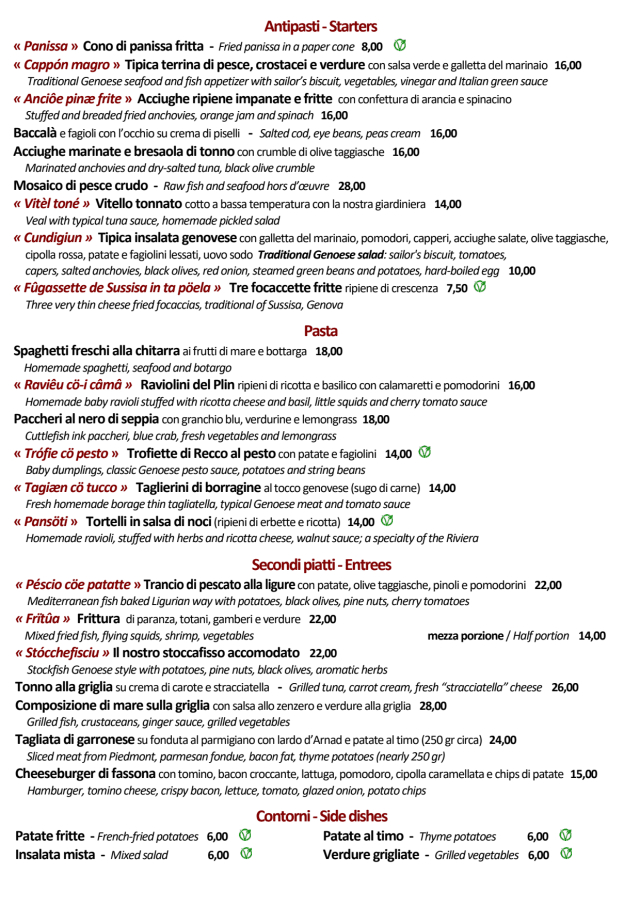 10/10This is my favorite Old Port restaurant in Genoa and I visit every summer. It's got a great outdoor patio with lovely views of the boardwalk and the boats lined up behind it. I have celiacs and the restaurant has a gluten-free menu and the waiter and cook are very attentive to food allergies. I always order fish and it is always fresh. I really love this place and highly recommend it.