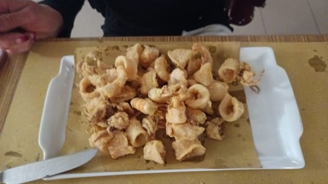 Frittura leggera e croccante di anelli di calamari tagliati al momento e code di gambero