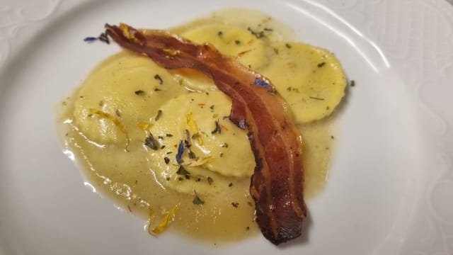 Tortelloni ripieni di crema di carbonara serviti con pancetta croccante su crema di pecorino
