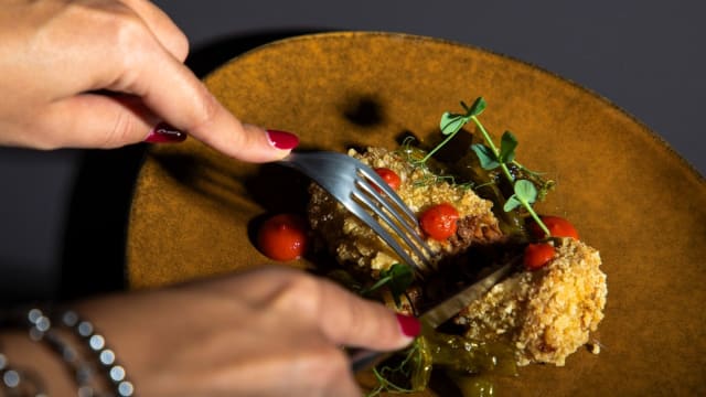 - Cotto a bassa temperatura, in crosta di patate americane con scalogno, maionese e senape