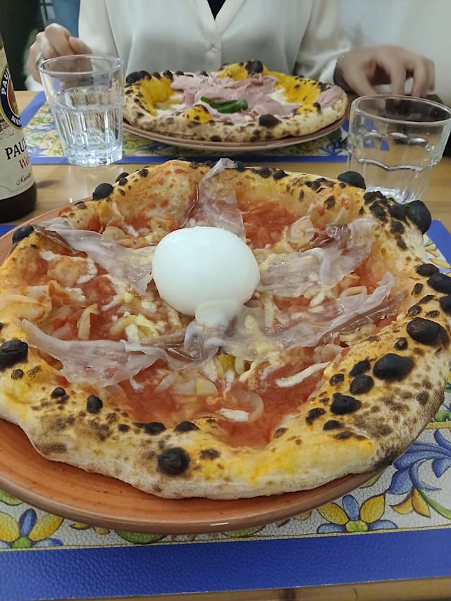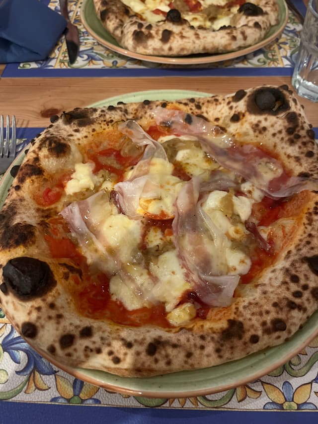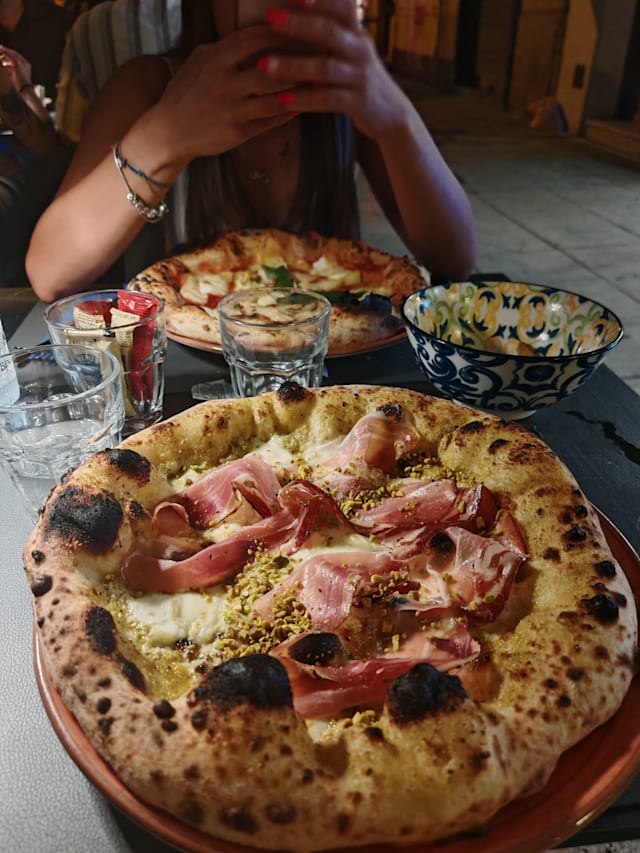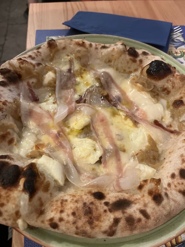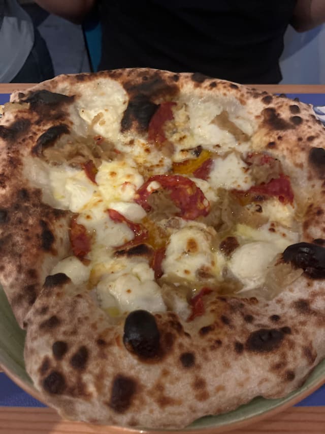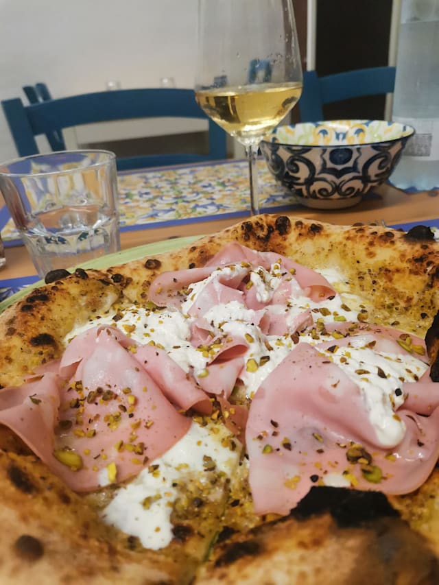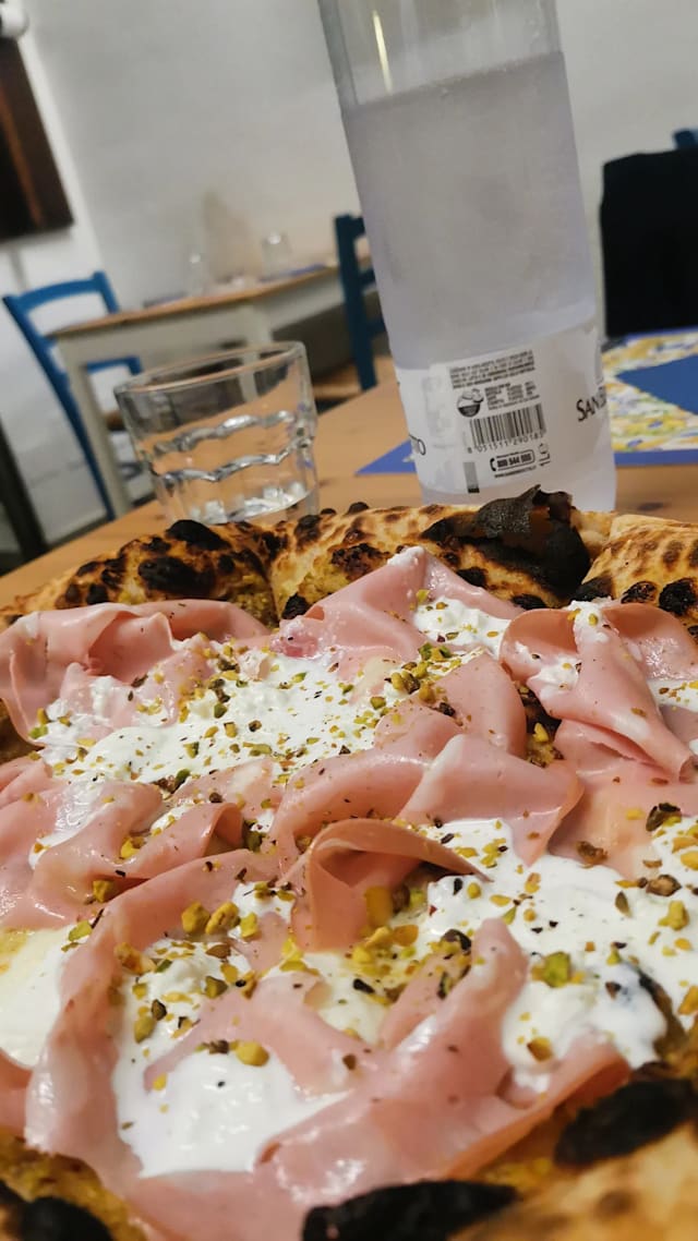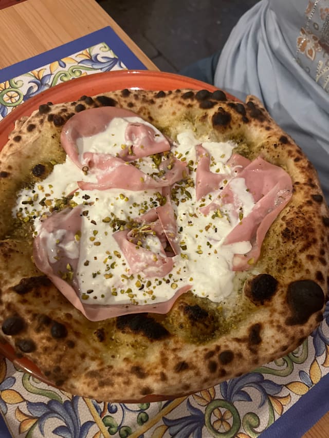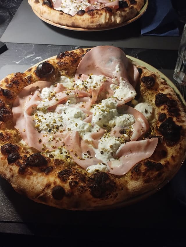 (Fiordilatte, pesto di pistacchio di bronte, funghi porcini, speck IGP, granella di pistacchio di bronte)