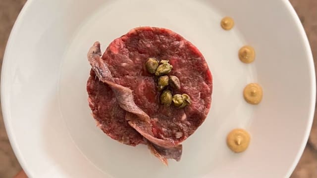 Carne di bovino spagnolo con burrata e acciughe del mar cantabrico