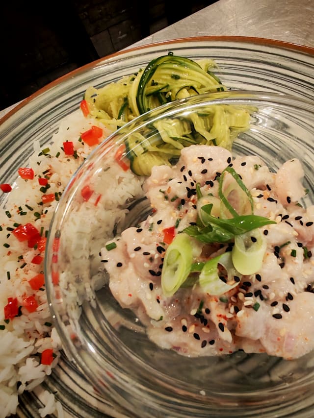 Tartare de lieu noir, leche de tigre échalotes et ciboulette, accompagné de tagliatelles de courgettes au citron et riz thaï