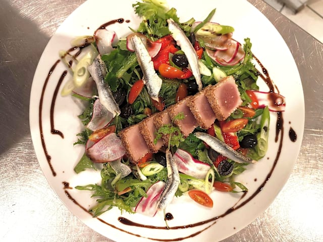 Pavé de thon rouge pané aux graines de sésame, sur une salade de mesclun, cebettes, poivrons marinés, radis, olives, boquerones.