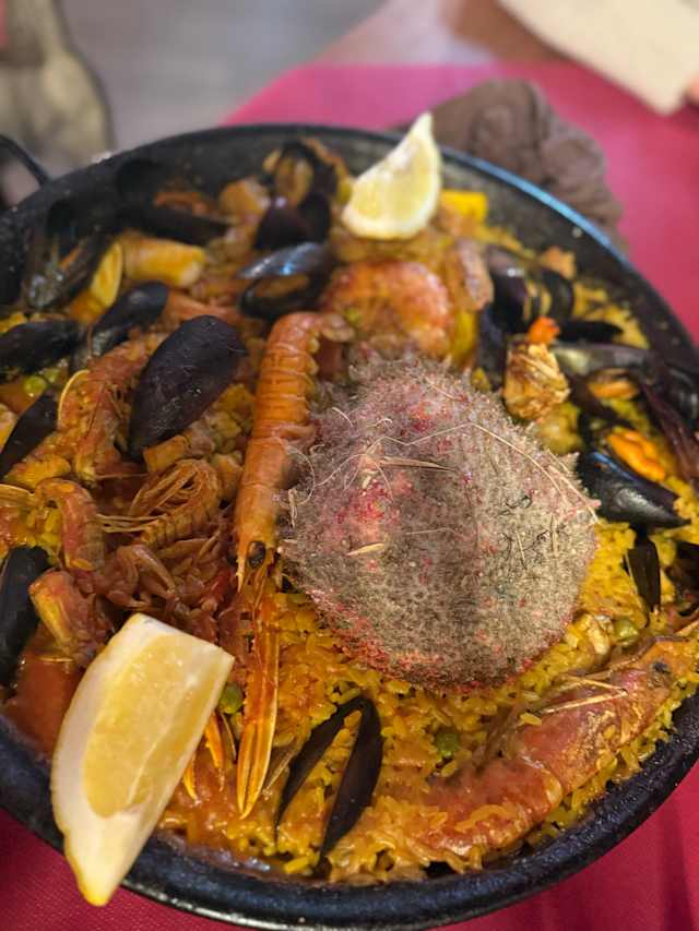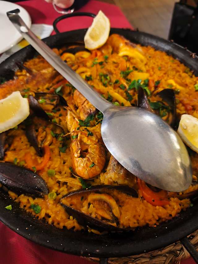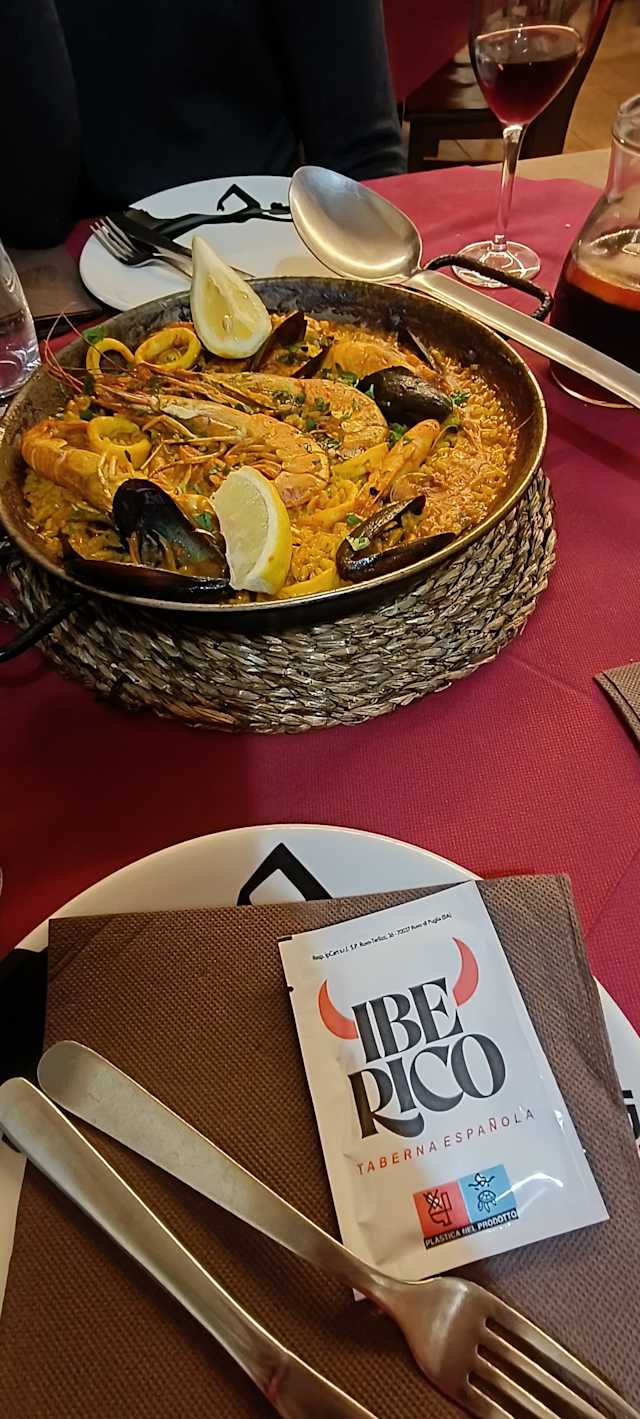 - Paella tipica spagnola a base di carne (pollo e maiale) e pesce (frutti di mare misti: gamberi, calamari, scampi), piselli, peperoni, zafferano e aglio