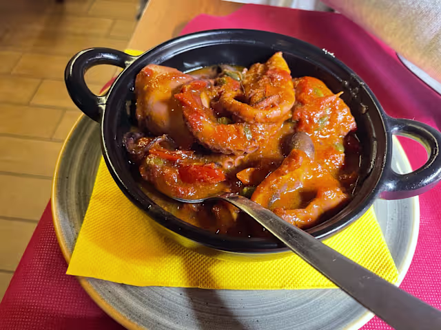 - Polipo arrostito sulla piastra servito su letto di patate lesse e arrostite, speziato con paprika